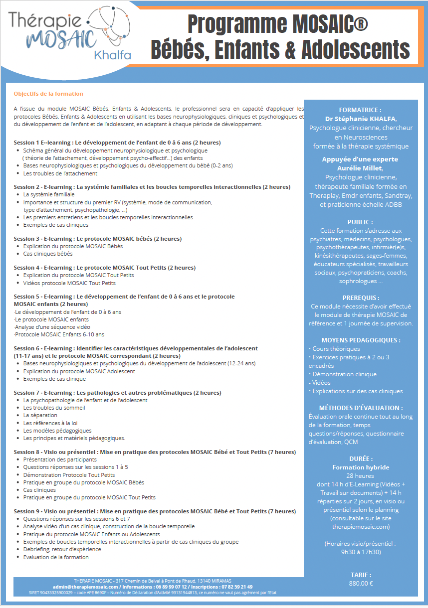 Objectifs de la formation : A l’issue du module MOSAIC Bébés, Enfants & Adolescents, le professionnel sera en capacité d’appliquer les protocoles Bébés, Enfants & Adolescents en utilisant les bases neurophysiologiques, cliniques et psychologiques et du développement de l’enfant et de l’adolescent, en adaptant à chaque période de développement.