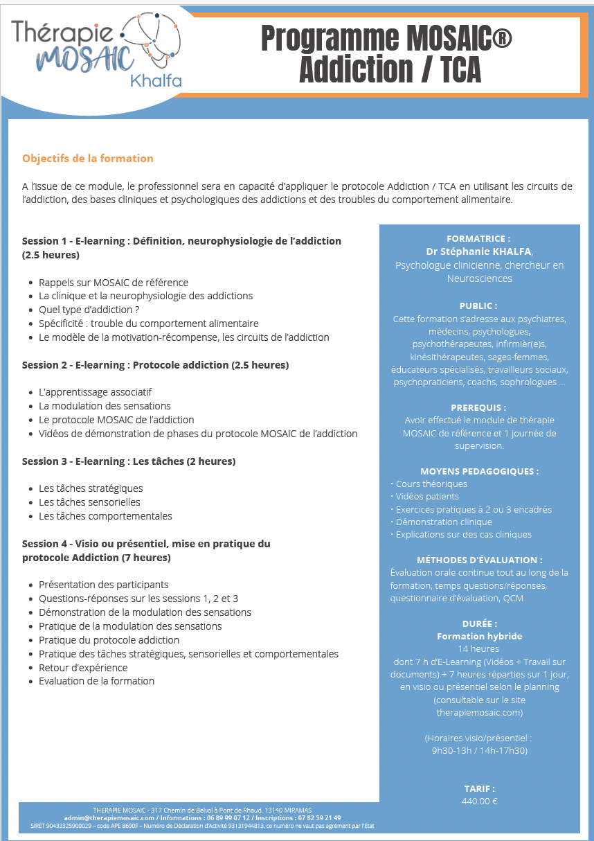Objectifs de la formation : A l’issue de ce module, le professionnel sera en capacité d’appliquer le protocole Addiction / TCA en utilisant les circuits de l’addiction, des bases cliniques et psychologiques des addictions et des troubles du comportement alimentaire.
